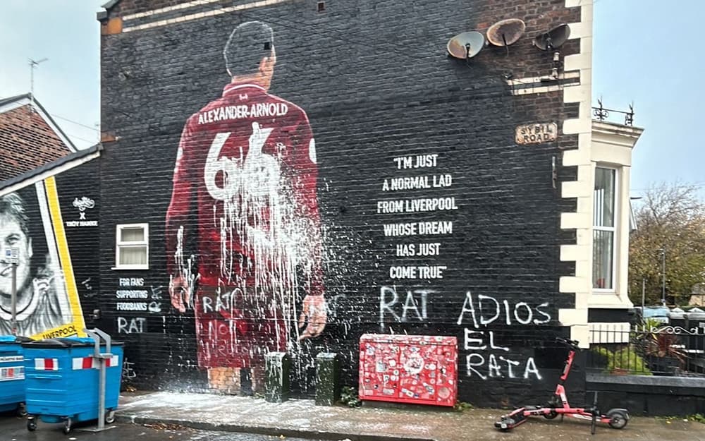 Trent Alexander-Arnold’s Anfield homecoming has started in awkward manner as a mural celebrating Trent’s Liverpool career gets defaced with the word “rat”.