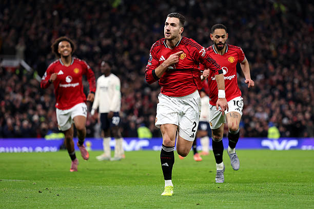 Diogo Dalot celebrates scoring United’s first goal during the match against West Ham United. (Photo by Justin Setterfield/Getty Images)
