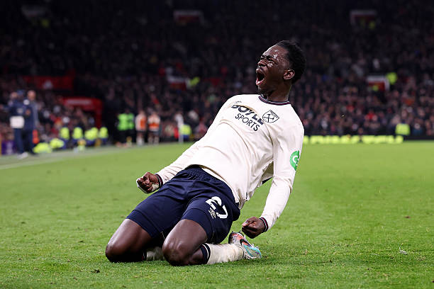 Soungoutou Magassa celebrates scoring the equalizing goal at Old Trafford (Photo by Alex Livesey/Getty Images)