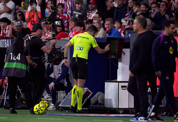 Referee Mateo Busquets Ferrer checks the VAR during the LaLiga match between Atletico de Madrid and FC Barcelona. (Photo by Aitor Alcalde/Getty Images)
