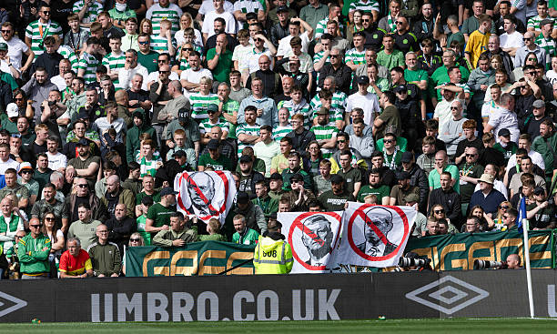 Celtic fans hold up flags against Michael Nicholson, Dermott Desmond and Peter Lawwell. (Photo by Craig Foy/SNS Group via Getty Images)