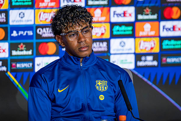 Lamine Yamal speaking to the Press ahead of the Champions League 2025/26 Quarter-Final Second Leg match against Atletico de Madrid. (Photo by Eurasia Sport Images/Getty Images)