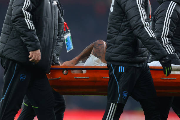 Gabriel Jesus stretchered off injured during the Emirates FA Cup Third Round match between Arsenal and Manchester United at Emirates Stadium on January 12, 2025 in London, England. (Photo by James Gill – Danehouse/Getty Images)