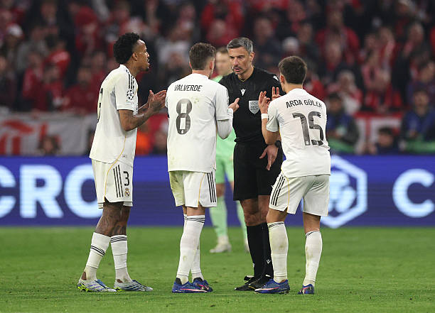 Eder Militao, Federico Valverde and Arda Gueler protest to Referee Slavko Vincic after their teammate Eduardo Camavinga (not pictured) was sent off (Photo by Adam Pretty/Getty Images)