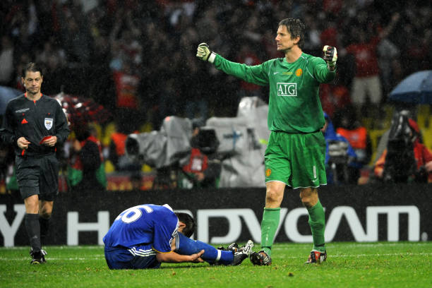 John Terry  reacts after missing his penalty while Edwin van der Sar of Manchester United celebrates during the penalty shootout during the UEFA Champions League final between Manchester United and Chelsea . (Photo by Etsuo Hara/Getty Images)