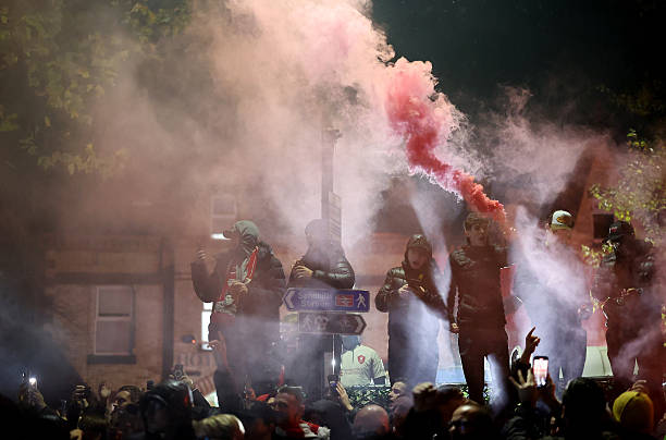 Fans set off smoke flares as they enjoy the pre match atmosphere prior to a UEFA Champions League match at Anfield. (Photo by Carl Recine/Getty Images)