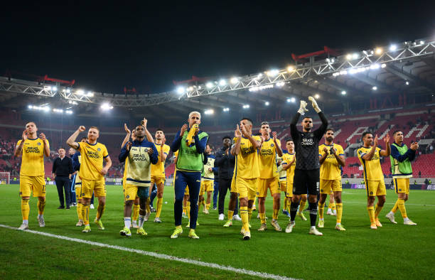 Maccabi Tel Aviv players applaud their fans after a match. (Photo by Sebastian Widmann – UEFA/UEFA via Getty Images)