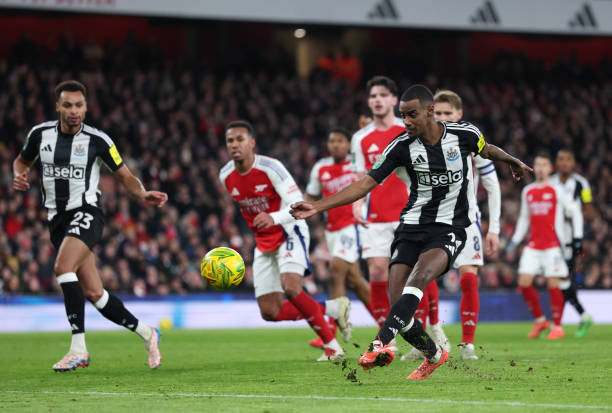 Alexander Isak scores his Newcastle’s first goal during the Carabao Cup Semi Final First Leg match against Arsenal (Photo by Alex Pantling/Getty Images)