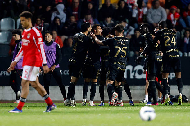 Casa Pia’s players celebrate their equalizing goal against Benfica. (Photo by FILIPE AMORIM / AFP via Getty Images)