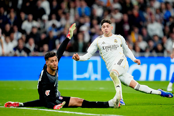 Federico Valverde scores during the La Liga EA Sports match between Real Madrid CF and Atlético de Madrid. (Photo by Jose Breton/Pics Action/NurPhoto via Getty Images)