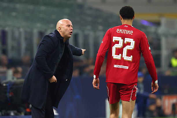 Arne Slot Head speaks with Hugo Ekitike (Photo by Giuseppe Cottini/Getty Images)
