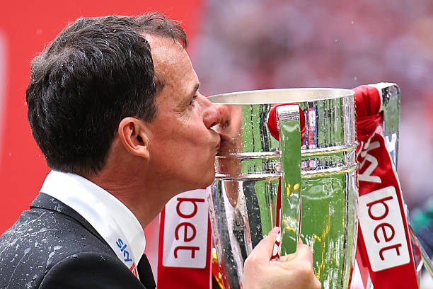 Regis Le Bris the manager of Sunderland kisses the EFL Sky Bet Championship Final trophy during the Sky Bet Championship Play-Off Final match between Sheffield United and Sunderland at Wembley Stadium on May 24, 2025 in London, England. (Photo by Robbie Jay Barratt – AMA/Getty Images)
